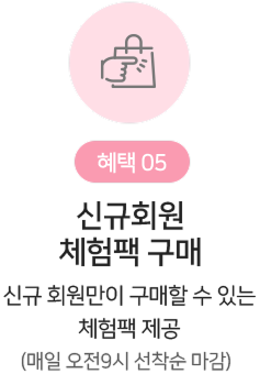 체험팩은 신규회원몰 상품과 별도로 구매가 가능합니다.(회원가입후 신규회원몰 구매이력을 제외한 구매이력이 없는 첫 번째 구매시에만 이용가능합니다.)